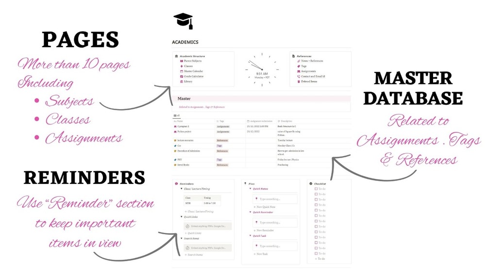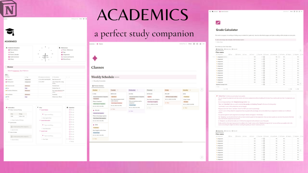 As a university or college student, there are many things to keep organized – class schedules, assignments, tasks, notes, research… and so much more. Manage everything comfortably from one neat clean and unified dashboard. In this template, every page has its worth. The pages include the following: "subjects", "classes", "calendar" and so on. These notes can help store your class and study data.